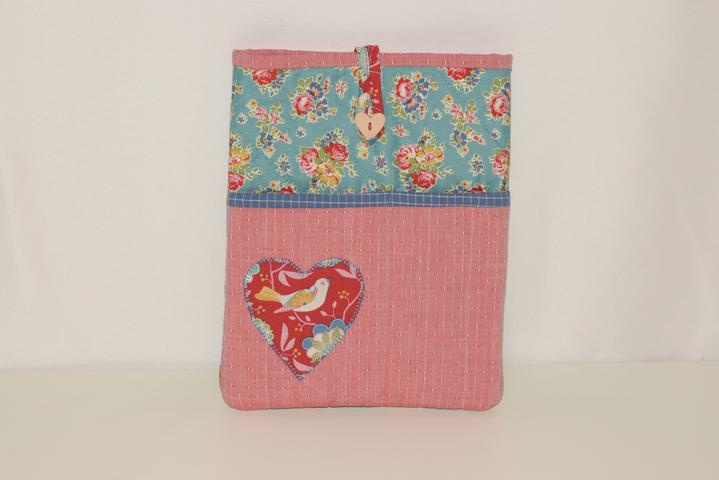 Questa custodia per Kindle è un accessorio artigianale dal fascino romantico, realizzato con una sapiente combinazione di tessuti della collezione Tilda in 100% cotone. Il design gioca sul contrasto cromatico tra il rosso vibrante e l'azzurro polvere, arricchito da motivi floreali e illustrazioni di piccoli uccellini.