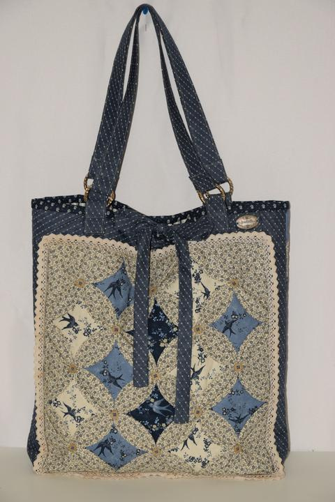 Questa spaziosa borsa shopper celebra l'arte del cucito creativo con la raffinata tecnica Cathedral Window (Finestra della Cattedrale). Realizzata con i pregiati tessuti 100% cotone della collezione Bluebird's Nest di Kansas, è un pezzo unico che unisce maestria artigianale e stile vintage.