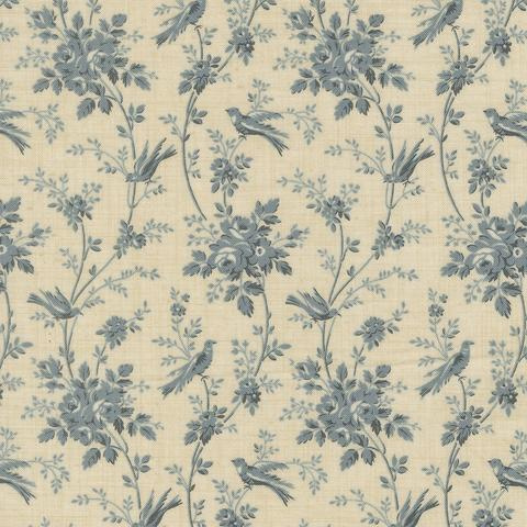 Colore: Uccellini e rose in blu vintage (Faded Blue) su fondo Pearl (avorio).