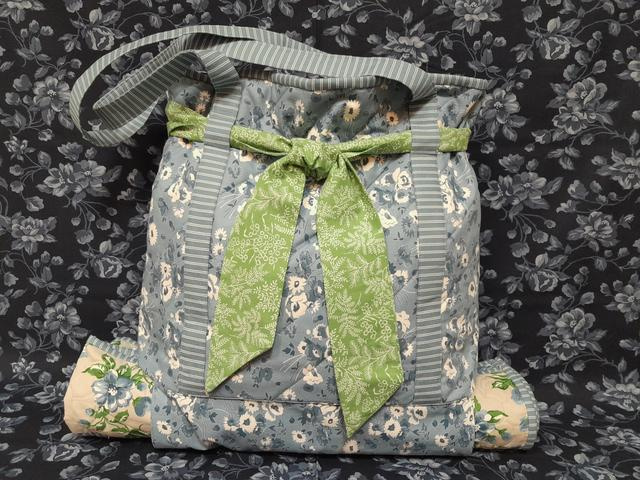 Tessuto esterno per la borsa, manici a righe e nastro per il fiocco.