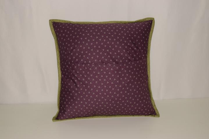 Dettagli di Pregio: Bordatura perimetrale in verde salvia a contrasto e pannello posteriore in tessuto prugna coordinato con motivi delicati.